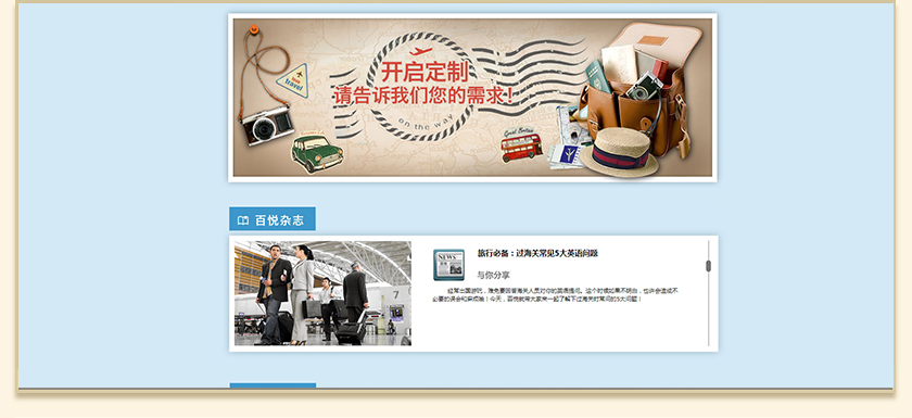 Project Description 百悦逸游于2012年初由二位资深的旅行家创办,是成都传媒集团旗下成都新闻国际旅行社有限公司的高端旅游品牌,总部位于成都高新区天府大道中段美年广场。在百悦逸游成立之前,创始团队亲自到全球三十多个国家实地考察,带着第一手的资讯和执着的信念创立了中国西部第一家真正意义上的私人定制旅行机构。百悦的旅行不是跟团挤大巴,不是十天去十个国家,更不是没完没了的... Official website address 三明http://www.100.travel I want to share